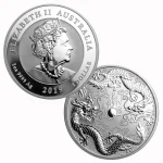 The coin’s reverse depicts exquisitely detailed representations of two dragons and a flaming pearl, with a stylized representation of clouds in the background. The design includes The Perth Mint’s “P” mintmark