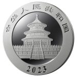 Instead of one, the 2023 obverse design has two pandas. In the image, one panda is on the floor, trying to help the other get down from higher foliage. The coin’s description regarding weight, metal content, and fineness – “30 gr Au .999” – is aside, and the face value of 10 Yuan is on the lower right.