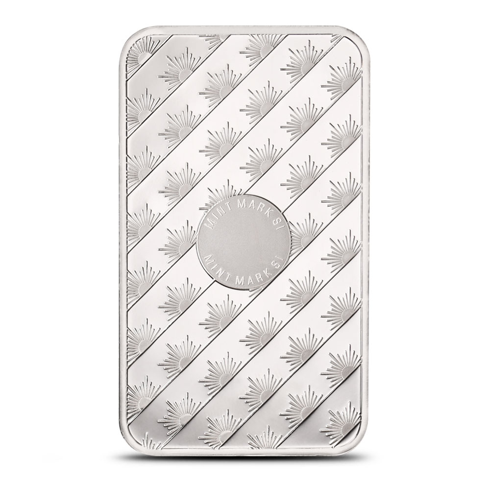 Each 5 oz Sunshine Minting Silver Bar contains the iconic silver eagle design which features an eagle flying in front of the shining sun. Around the image are the words “Sunshine Minting.” Below the silver eagle are stamps denoting the bar’s weight “5 Ounces” and “.999 Fine Silver.” On the reverse of the bar is an image of the rising sun arranged in a repeating diagonal pattern. Also located on the back is a unique security feature that can be verified using a Sunshine Minting Decoder Lens.